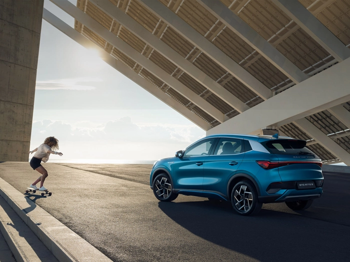 De SUV heeft een sportief en aerodynamisch design. Het speelse interieur geeft de ATTO 3 een uniek karakter.