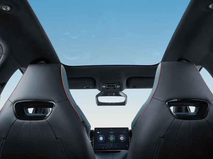 Het panoramische glazen dak van deze elektrische hatchback zorgt voor een ongeëvenaard breed zicht, laat veel licht binnen en geeft een ruimtelijk gevoel.