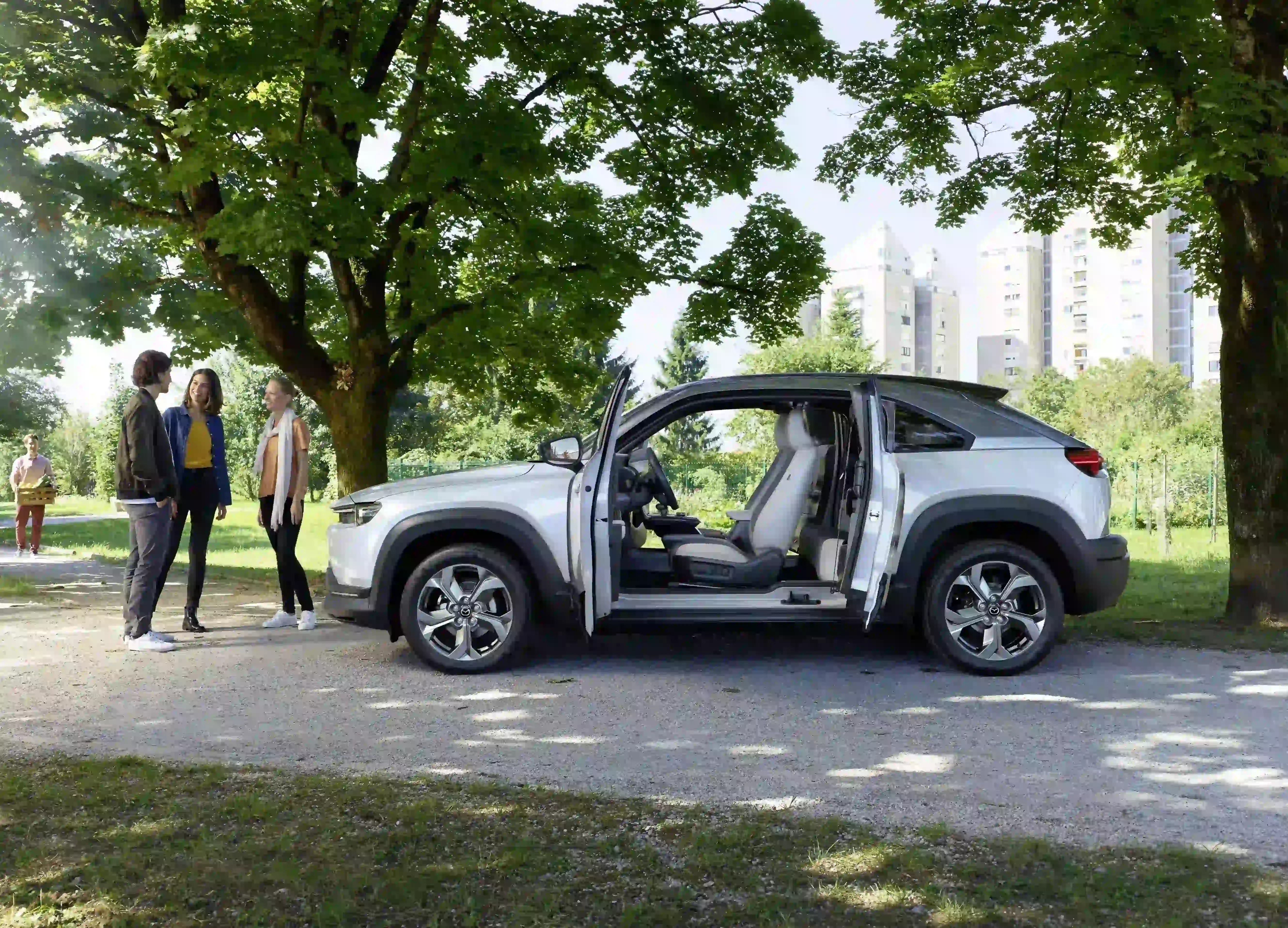 De Mazda MX-30 rijdt u emissievrij, want de auto is volledig elektrisch aangedreven.
